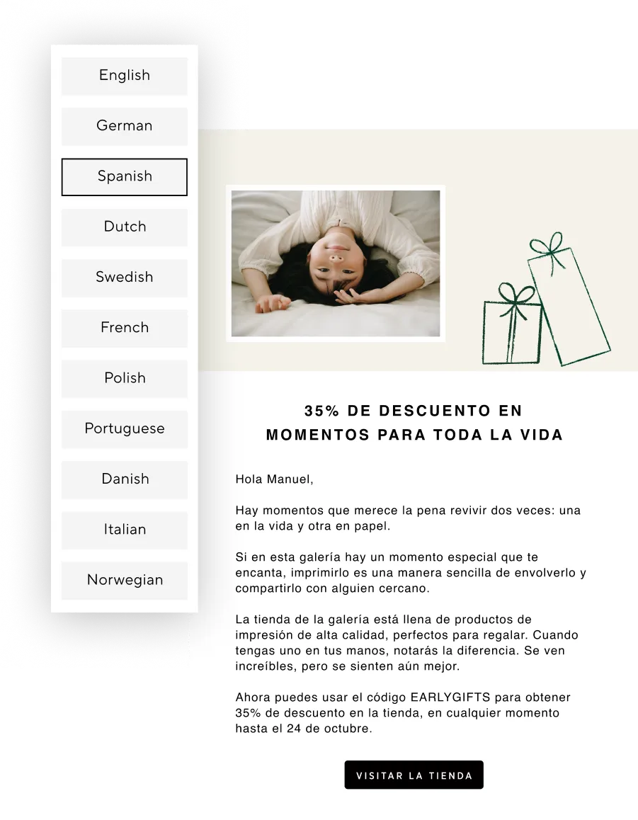 The campaigns have been professionally translated and localized to offer a seamless, personal feel, no matter what language your clients speak.